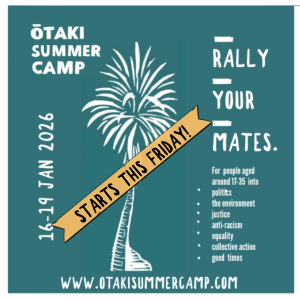 Rally your mates for Ōtaki Summer Camp - a four day annual gathering for people (aged around 17-35) who care about politics, justice, anti-racism, equality and the environment. Camp is for people just beginning to explore political ideas AND experienced change-makers and activists, keen to get together to kick off this key election year well.