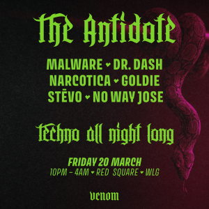 Venom returns with The Antidote - a club night featuring techno all night long at Red Square. Moving through psy tech, driving techno, hard bounce, hard techno / neo-rave, and raw techno with the energy building and morphing as the night unfolds.