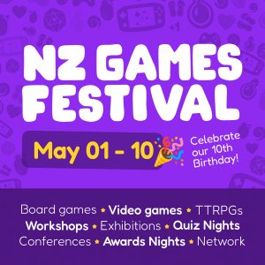 NZ Games Festival celebrates its 10th birthday this year! For a decade, NZGF has held space for game makers, students, families, and enthusiasts to come together, and celebrate Kiwi made games.