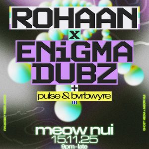 Shellington season is in effect! Following the success of last month's Warehouse Rave featuring Coki, Ghost Media are bringing the heat to Meow Nui for the first time, and they've got a treat in store for us! This time it's a blockbuster double header featuring ROHAAN & ENIGMA DUBZ, with support from local legends Pulse and Barbwyre.