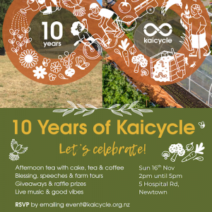 There will be nibbles, cakes, tea and coffee, live music, speeches, farm tours, seedling giveaways, raffle prizes and more! So that we know how much cake to bake, please RSVP emailing event@kaicycle.org.nz.