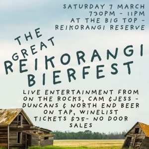The Great Reikorangi Bierfest. One night only 7th March from 7:30pm to 11:00pm at the Big Top, at the Reikorangi Reserve, near Waikanae on the Kapiti Coast - enjoy live music and local Kapiti beers on tap and food from the grill.